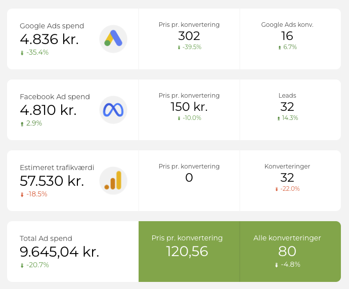 Nedenstående skærmprint er fra en af vores standard marketing rapporter, hvor vi afrapportere en 360 graders marketingløsning. Vi har over det seneste år taget kunden fra et adspend på på Facebook og Google Ads på samlet 30.000 kr. pr. md. og reduceret det til ca. 10.000 pr. md. uden, at de får færre konverteringer.